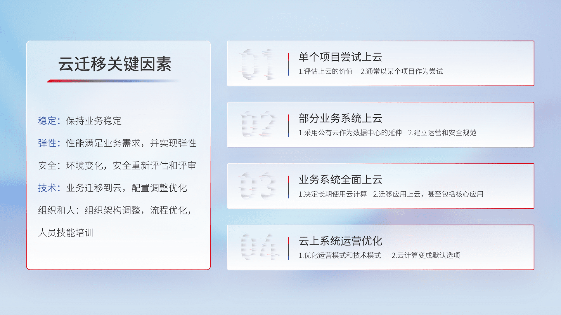 结合实际业务,,从规划设计、、云平台选型、、云原生改造、、、数据迁移、、、集成交付,,,,迁移全过程为客户识别最佳上云路径,,,做好风险识别管理,,,设计网络架构、、、、身份权限、、安全审计合规、、操作审计、、日志审计、、监控告警策略、、、、多站点容灾设计等,,对云上基础设施进行整体规划,,提升IT治理水平,,,以满足弹性、、、、高可用、、高性能的需求。。。。