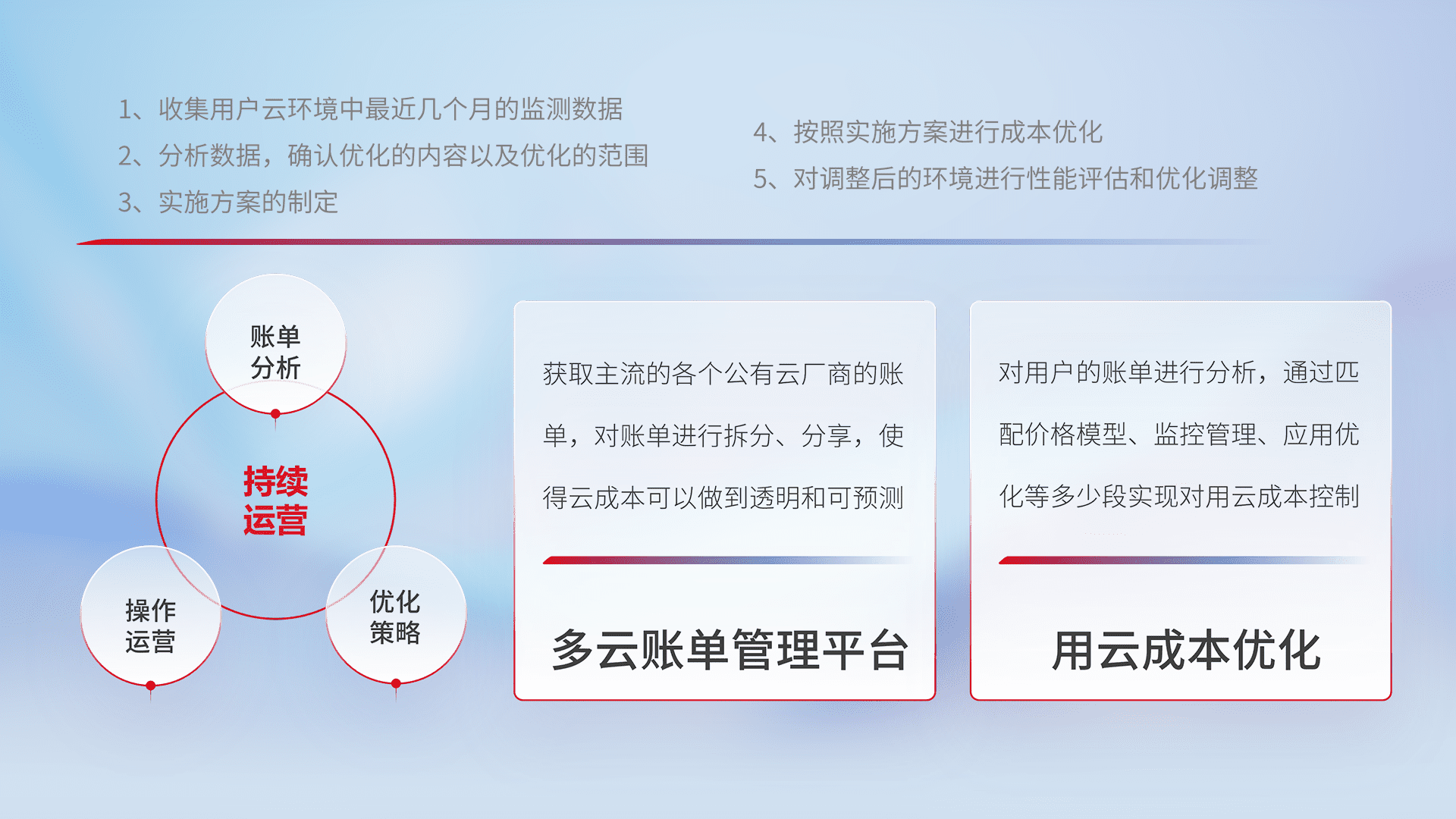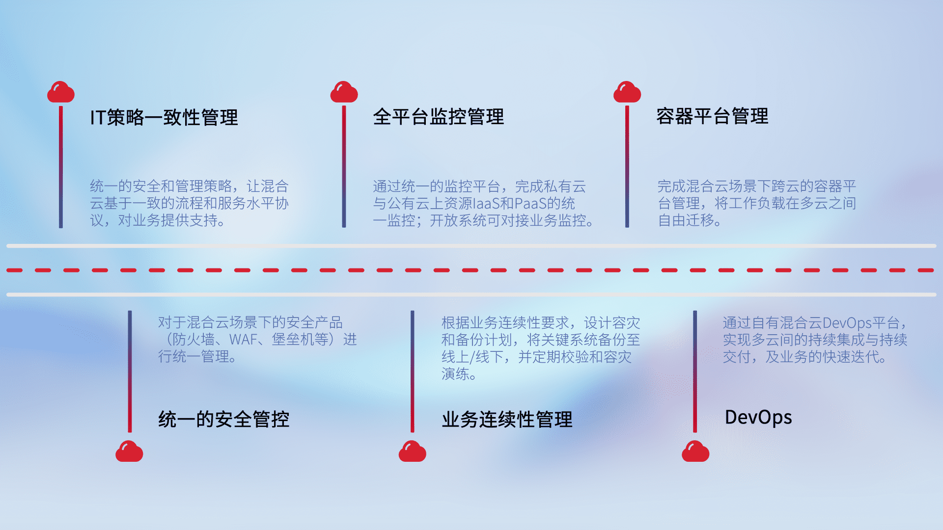 通过多云纳管,,,以统一的资源数据模型把客户的云资源进行抽象和封装,,,,进而实现对多云资源的统一操作,,保障云资源管理的可靠性、、、稳定性与可用性。。。量身定制化运维内容,,,,配置、、、、开发运维、、补丁管理、、、、备份、、、、监控、、、认证和访问管理、、、、审计和日常巡检等,,保障在用云过程中的可靠度,,稳定度以及高可用率。。
